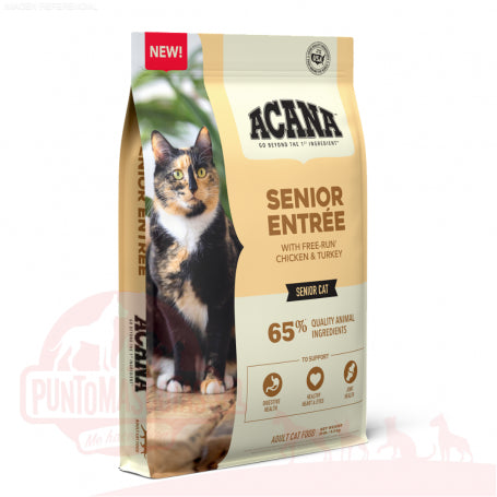 Especialmente diseñada para su gato mayor, nuestra Receta de Entrada Senior ACANA™ es especialmente adecuada para satisfacer las necesidades de su felino adulto. Rico en un 65 % de ingredientes animales de calidad, incluidos pollo y pavo criados en libertad, Senior Entrée tiene la proteína animal que su gato adulto necesita para ser lo mejor. Esta receta rica en nutrientes también ayuda a respaldar beneficios clave para la salud de su gato mayor, incluida la salud digestiva, la salud del corazón y los ojos y la salud de las articulaciones.