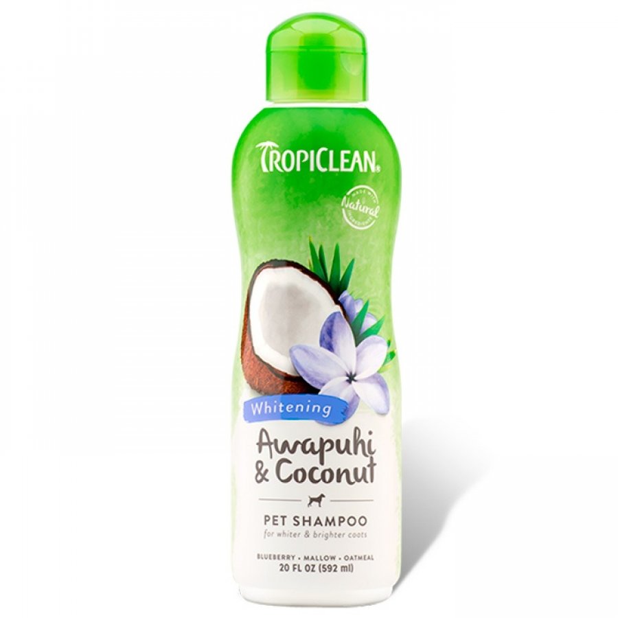 TROPICLEAN® Awapuhi Shampoo para perros y gatos Cuando el pelaje blanco comienza a verse un poco más amarillo, un champú blanqueador natural es justo lo que necesita para iluminar el pelaje de tu peludito. No contiene jabon, enriquecido con proteínas naturales, awapuhi y vitamina E que iluminan los abrigos blancos y dejan a su mascota con su pelaje suave y con un aroma formidable. TROPICLEAN® Ha desarrollado productos líderes en la industria, desde lujosos shampoos para mascotas, hasta productos para el cuidado bucal fáciles de usar, que brindan a las mascotas y las personas una mejor vida. Utilizan productos de origen natural, saludables, siempre exhibiendo los ingredientes, su propósito y origen para demostrar la seguridad con la que pueden ser usados. Además, tiene como misión de vida no solo brindar soluciones a las mascotas y sus personas, sino también, dar de vuelta algo a la comunidad. Es por esto que gracias a sus ingresos, destina directamente parte de ellas al apoyo de personas con necesidades básicas insatisfechas en países como Guatemala y Haití, entre otros, a través de Gifts of Love International, construyendo incluso un hogar para niños brindándoles alimentación y techo a muchos. Además, también ha apoyado al bienestar y la mejora de la calidad de vida de las mascotas a través de programas como Landon's Helping Paws. Las ventajas de este producto son: Shampoo sin Jabón Al no contener jabón, no interrumpe tratamientos de pulgas. Para todos Puede ser usado tanto en perros como en gatos.. Awapuhi y arandanos Elemento que ayuda a realzar los colores naturales. Harina de avena Ayuda a prevenir la piel seca INGREDIENTES Agua purificada, limpiador suave de coco, proteína vegetal hidrolizada, avena sativa avena, mezcla orgánica de (extracto de awapuhi, extracto de arándano, extracto de manzanilla, extracto de frambuesa, extracto de yuca, extracto de malva), fragancia, vitamina E. INSTRUCCIONES Agita la botella, agrega el producto sobre su pelaje húmedo, masajea durante 3 a 5 minutos y enjuaga bien, cuidando que no queden residuos. Seguro para uso diario. Seguro para perros y gatos.