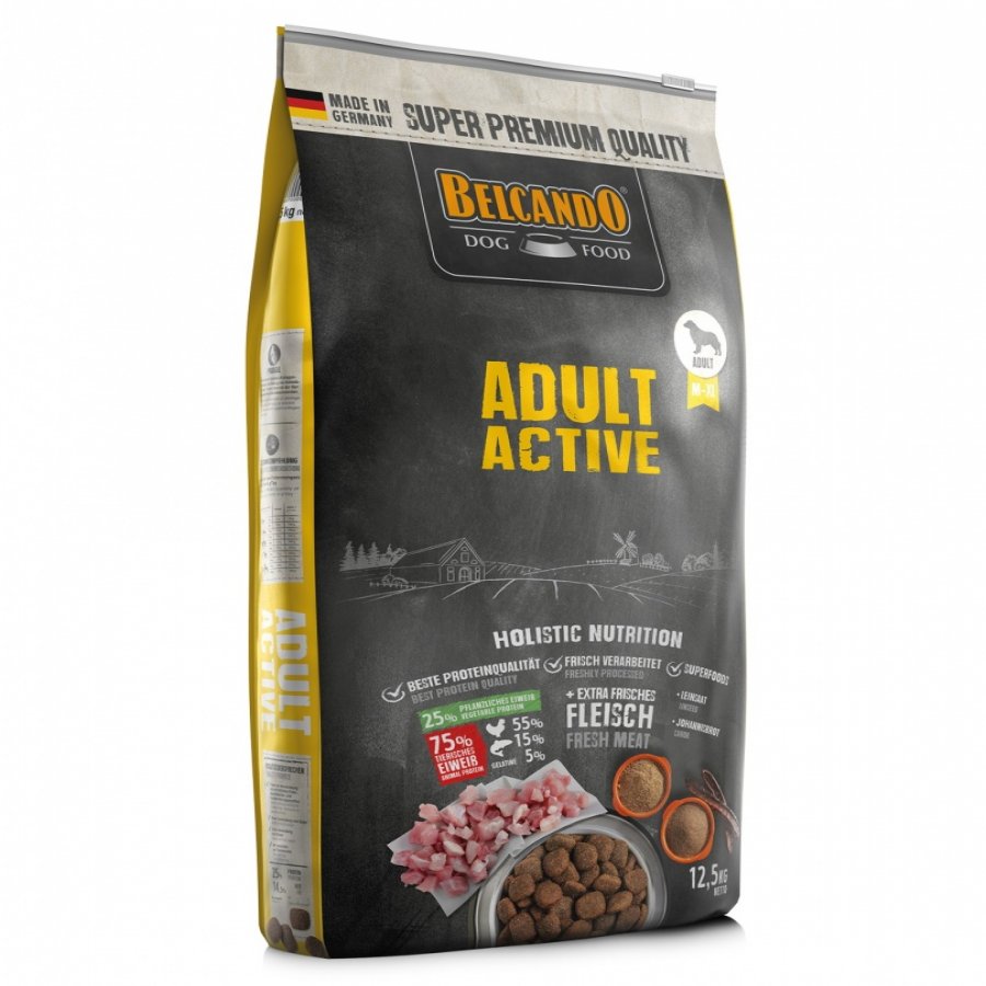 Adult Active de BELCANDO® Es un alimento para perros adultos con un gran nivel de actividad física. Solo las mejores materias primas: carne de ave de fácil digestión, los valiosos ácidos grasos Omega-3 de las semillas de lino y los saludables granos de algarroba que aportan importantes taninos y sustancias vitales, hacen que esté alimento esté adapatado a las necesidades energéticas de los perros activos y favorece la resistencia y la forma física en los deportes y las actividades de ocio. BELCANDO® es una empresa alemana que nace como resultado de un enfoque holístico, el cual mantiene la vitalidad del perro con componentes naturales y equilibrados. Los apreciados ingredientes funcionan juntos como un complejo natural, es por eso que, cada día veterinarios y nutricionistas trabajan para mejorar las recetas. Estos forman la base para la obtención de ingredientes de alta calidad, además, siguiendo un control a fondo en sus labotarios, los componentes son mezclados según la receta y cocinados al vapor para conservar sus sensibles nutrientes y sus sabores naturales. Las ventajas de este producto son: Semillas de Lino: Son ricas en ácidos grasos de alta calidad, se usan en conocidos remedios caseros, los cuales tienen un efecto positivo en la piel y el pelo del perro. Algarroba: Ayuda al sistema digestivo, ya que contiene una gran cantidad de taninos y sustancias vitales. Sin Gluten: Elaborado sin trigo ni otros cereales con gluten. Sin Láctosa: Elaborado sin productos lácteos. Garantía de Calidad: Garantizado a partir de los mejores ingredientes con excelente sabor y palatabilidad. Además contiene proteína derivada directamente de carna apta totalmente para el consumo humano. Guía de alimentación (g/día): Peso del perro normal activo Peso del perro nomal activo 3 kg 60g 70g 25 kg 280g 330g 5 kg 80g 100g 35 kg 360g 420g 10 kg 140g 160g 50 kg 470g 550g 15 kg 190g 220g 35 kg 580g 670g 20 kg 240g 280g 50 kg 670g 780g