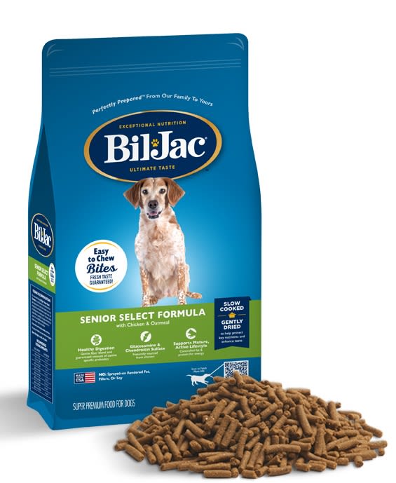 El alimento seco para perros Bil-Jac Senior Select está formulado para ayudar a mantener su salud con niveles controlados de grasas y proteínas para obtener energía y un estilo de vida activo. Cocido a fuego lento y secado suavemente, este método de cocción ayuda a proteger los aminoácidos esenciales para el soporte de los músculos magros. Los bocados deliciosos y fáciles de masticar facilitan la hora de comer al ayudar con los problemas de dientes o mandíbula que los perros pueden desarrollar a medida que maduran. La mezcla especializada de fibras suaves ayuda a mantener un tracto gastrointestinal saludable, lo que facilita la limpieza del patio trasero. La glucosamina y el sulfato de condroitina se obtienen naturalmente del pollo fresco. Los probióticos específicos para perros ayudarán a respaldar una digestión saludable todos los días y el sistema inmunológico para una vida saludable en general. Los ácidos grasos omega 3 y 6 de origen natural ayudarán a que su perro tenga un pelaje brillante y completo. Bil-Jac Senior Select alimento seco para perros, nutrición completa y equilibrada para perros adultos de 7 años o más, tiene los nutrientes vitales necesarios para ayudar a tu perro a madurar de forma feliz y saludable.