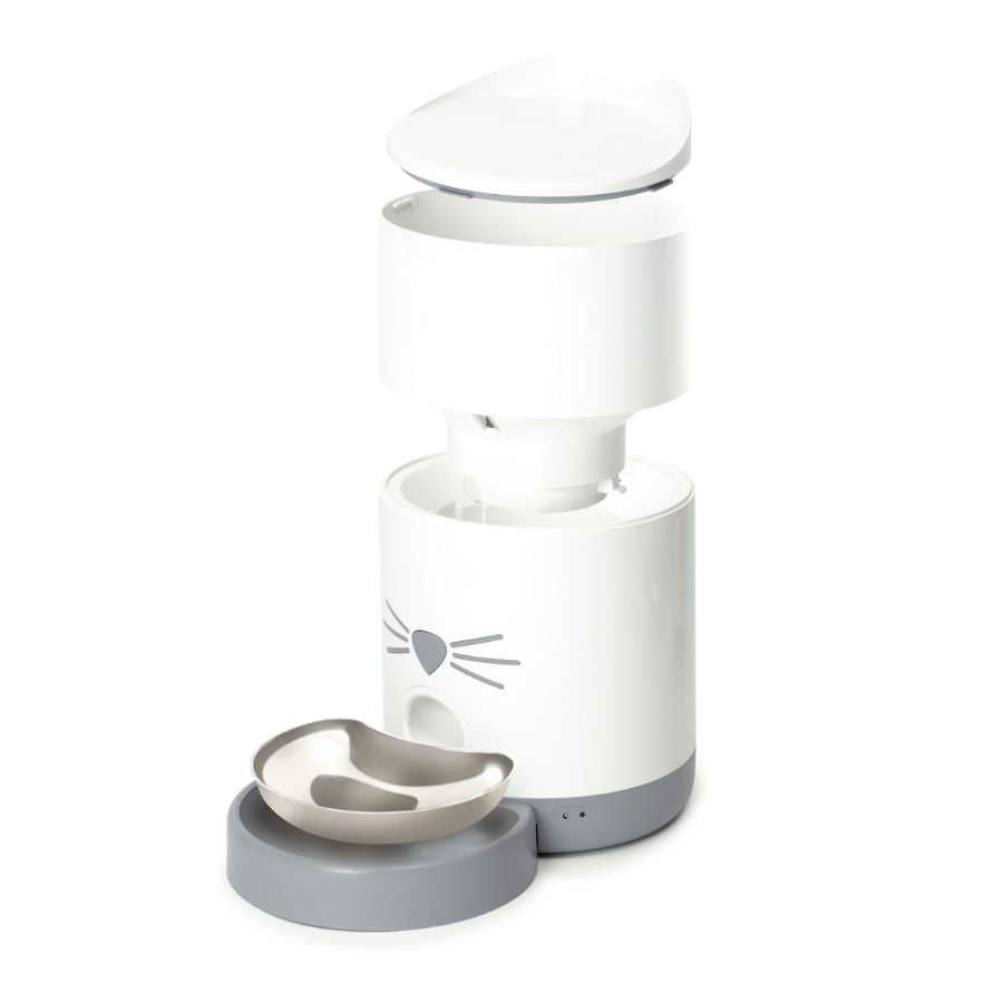 El Comedero Inteligente Catit PIXI para gatos está diseñado para dispensar la cantidad exacta de pienso para los gatos. Se ha fabricado con las últimas tecnologías y contiene un mecanismo anti-obstrucción inteligente. El Comedero inteligente Catit PIXI puede controlarse mediante una aplicación móvil gratuita, la Catit® PIXI ™, para programar la correcta alimentación del gato. Las características de este producto son: Se puede alimentar al gato según el horario que sea mejor para él. Por ejemplo, 6 comidas al día en porciones de 18 gr cada una. Tiene un depósito trasero con una capacidad de 1,2 Kg, en el que se guarda el pienso y se mantiene en perfectas condiciones. El tamaño de croquetas de pienso que se pueden usar en este comedero es el estándar, que está entre 7 u 9 mm de diámetro. Dispone de un anillo hermético que sella el depósito. En el interior de la tapa superior, se coloca una almohadilla deshumidificante para prevenir el moho, que se cambia cada 30 días. Motor silencioso con control anti atascamientos, de modo que detecta si un gránulo de pienso se ha quedado obstruyendo y gira en sentido contrario. Tiene un botón en forma de naricita que permite ofrecer una porción extra, o más porciones dependiendo el número de veces que se presiona. Se puede desactivar. La base también cuenta con dos luces LED de estado. El cuenco de acero inoxidable es apto para lavar en el lavavajillas y mantener el comedero limpio e higiénico. Lleva pilas de refuerzo, por si se va la luz, que durarán unas 58 horas aproximadamente. Consume 0,25W inactivo y menos de 1W al dispensar comida Se conecta a la luz mediante un adaptador USB con enchufe. Medidas: Ancho x largo x alto 19,1 x 19,1 x 34,2 cm Peso 1,67 Kg El Comedero Catit® PIXI™ puede controlarse mediante una aplicación móvil gratuita desarrollada especialmente para monitorizar los productos inteligentes Catit. Con esta práctica aplicación se pueden controlar muchas funciones de este comedero inteligente para gatos, de forma remota, y compartir el acceso directamente con familiares o amigos.