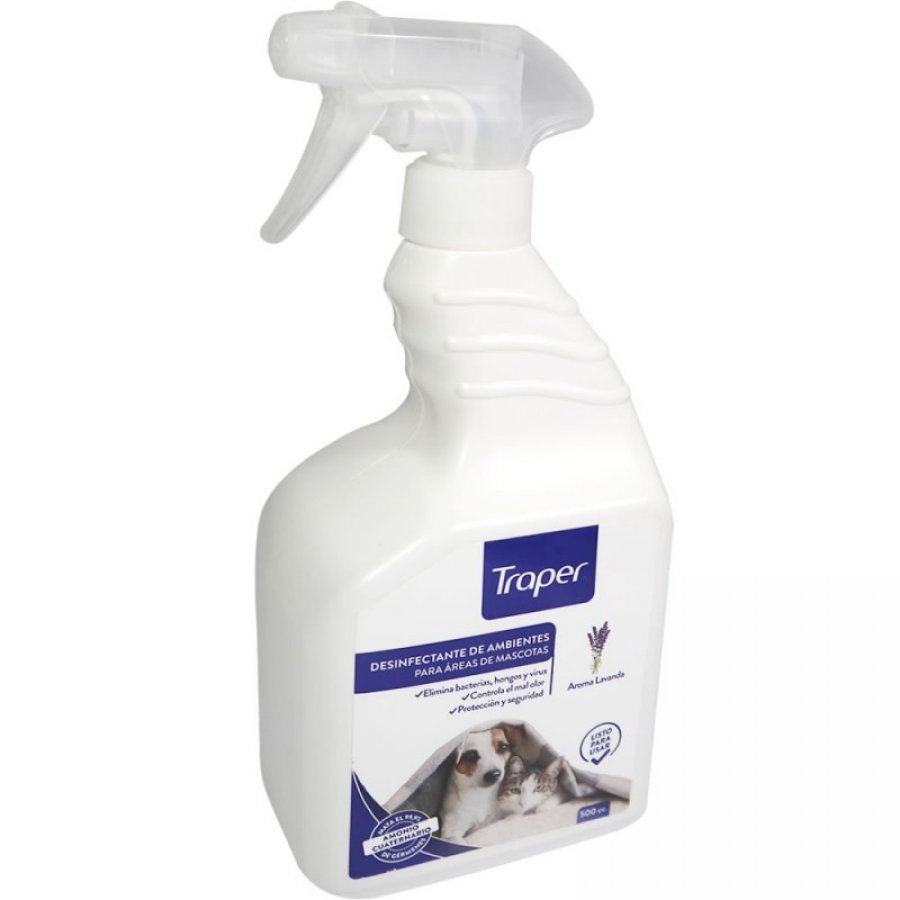 TRAPER DESINFECTANTE DE AMBIENTES, es una solución detergente y desinfectante a base de amonios cuaternarios, formulada para aplicar sobre superficies en las que las mascotas transitan, juegan o descansan, ya que posee una acción limpiadora, bactericida, fungicida y viricida, protegiendo de esta manera a las mascotas y personas de organismos patógenos causantes de enfermedades. TRAPER DESINFECTANTE DE AMBIENTES, posee un agradable aroma a lavanda, el cual, junto a su acción limpiadora y desinfectante, elimina los microrganismos causantes del mal olor. Composición: Mezcla de amonios cuaternarios ....... 0,167% Alcohol etílico........................................ 0,160% Otros componentes c.s.p. .................. 100 ml Las características y ventajas de este producto son: Desinfectante para áreas de perros y gatos. Incluye los amonios cuaternarios como ingredientes activo recomendados para la desinfección contra el virus SARS-CoV-2, el nuevo coronavirus causante de la enfermedad COVID-19. Modo de uso: Para uso en mesones, caniles, sillas, casas, juguetes, entre otros, aplique abundante cantidad del producto TRAPER DESINFECTANTE DE AMBIENTES sobre un paño seco y esparza con movimientos lineales sobre toda la superficie a desinfectar. Espere 10 minutos para que la superficie pueda volver a ser usada. Este procedimiento puede realizarse cada vez que necesite desinfectar las áreas descritas. Para uso en pisos de clínicas y peluquerías veterinarias, así como en el interior del hogar aplique TRAPER DESINFECTANTE DE AMBIENTES sobre una mopa o paño y esparza por toda la superficie a tratar. Espere 10 minutos hasta que seque y se pueda circular nuevamente. Recuerde usar guantes durante la aplicación y, al retirárselos, lávese las manos. Superficies con alto grado de suciedad requieren una limpieza previa con agua para alcanzar una mayor eficacia del producto. Cantidad: 500 c.c