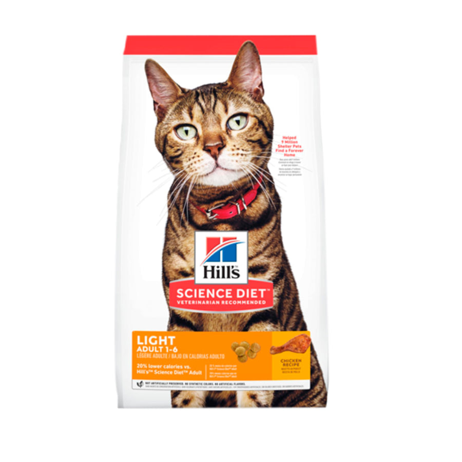 Hill's® Feline Adult Light Dry ofrece a tu amigo de cuatro patas una nutrición de gran sabor para una vida larga y feliz. Hecha con ingredientes saludables, esta receta nutritiva está balanceada para satisfacer las necesidades de tu felino, promoviendo un peso y sistema inmunológico sano. Cada ingrediente cumple con estrictos requisitos de pureza y contenido de nutrientes que superan los estándares de la industria. Formulado para gatos adultos de 1 a 6 años de edad que requieren menos calorías. HILL'S PET NUTRITION® tiene un compromiso con el bienestar animal, cree que el cuidado de calidad para las mascotas incluye nutrición, cuidados veterinarios a la salud, ejercicio diario y mucho amor. Todas las mascotas de Hill's Pet Nutrition viven en ese ambiente. Solamente usan métodos compasivos, no invasivos para desarrollar tecnología nutricional para que los perros y gatos del mundo tengan vidas largas y sanas. Las ventajas de este producto son: Peso ideal: Las bajas calorías y L-carnitina ayudan a promover un perso corporal ideal. Satisface hambre entre comidas: Las proteínas y fibras naturales de alta calidad ayudan a satisfacer el hambre entre las comidas. Omega-6s y vitamina E: Para una piel y pelaje sano y hermoso. Guía de alimentación: Peso ideal del gato - lbs (kgs) Cantidad por día - tazas (gramos) - Pérdida de peso Cantidad por día - tazas (gramos) - control de peso 4 (1,8) 1/3 (30) 3/8 (35) 6 (2,7) 3/8 (35) 1/2 (45) 8 (3,6) 1/2 (45) 5/8 (60) 10 (4,5) 5/8 (60) 3/4 (70) 12 (5,4) 2/3 (60) 7/8 (80) 14 (6,4) 3/4 (70) 1 (95) 16 (7,3) 7/8 (80) 1 (95) *Cantidades orientativas. Las cantidades diarias recomendadas deberán ser ajustadas a las condiciones ambientales, al nivel de actividad del perro y a su condición física. Mantener agua fresca disponible a todo momento.