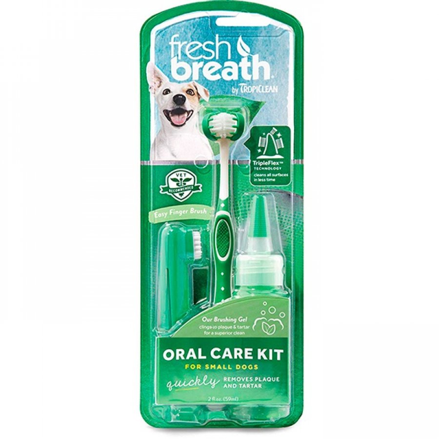 El cuidado oral es más que hacer que las sonrisas de sus mascotas brillen, es un componente importante de su salud en general. De hecho, el 80% de los perros comienzan a mostrar signos de enfermedad oral a la edad de 3 años. Nuestro kit de cuidado bucal Fresh Breath incluye nuestro cepillo de dientes TripleFlex ™, cepillo de dedos y nuestro gel de cepillado para perros. Nuestro gel de cepillado para perros está impregnado de extracto de hoja de té verde que se defiende naturalmente contra la placa y el sarro y se adhiere a sus dientes para una limpieza superior. Nuestro cepillo de dientes TripleFlex limpia 3 veces más rápido con sus sencillas cerdas de 360 ??grados. También se incluye nuestro cepillo para dedos que le permite limpiar suavemente ayudando a disolver la placa y el sarro. Dientes limpios, boca sana, perro feliz