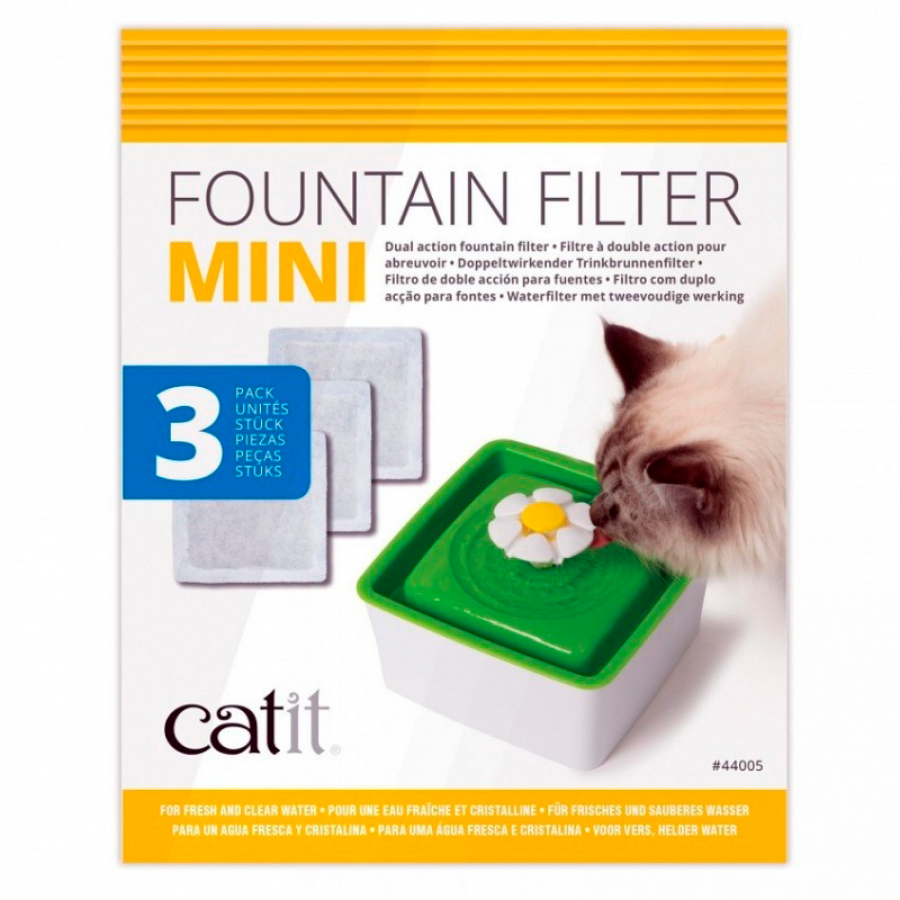 El Pack Filtros Fuente Mini Flower CAT IT® es un pack de 3 unidades del filtro especial para la fuente para gatos Catit Flower Fountain Mini. Se trata de filtros de doble acción que purifican el agua gracias al carbón activo que absorbe las impurezas de la misma. También retienen los pelos que puedan caer en la fuente y otros residuos. CAT IT® es una compañía especializada en el diseño de productos innovadores, estimulantes, convenientes, que fomentan el ejercício, la vida sana y la salud de tu gato en tiempos contemporáneos. Las ventajas de este producto son: 3 Unidades: Pack de 3 unidades del filtro especial para la fuente para gatos Catit Flower Fountain Mini. Purifican el Agua: Gracias al carbón activo que absorbe las impurezas. Fácil de limpiar: Se puede separar por partes y lavar de forma individual según corresponda. Retienen los Pelos: Cuenta con un protector que ayuda a retener los pelos que puedan caer en la fuente.
