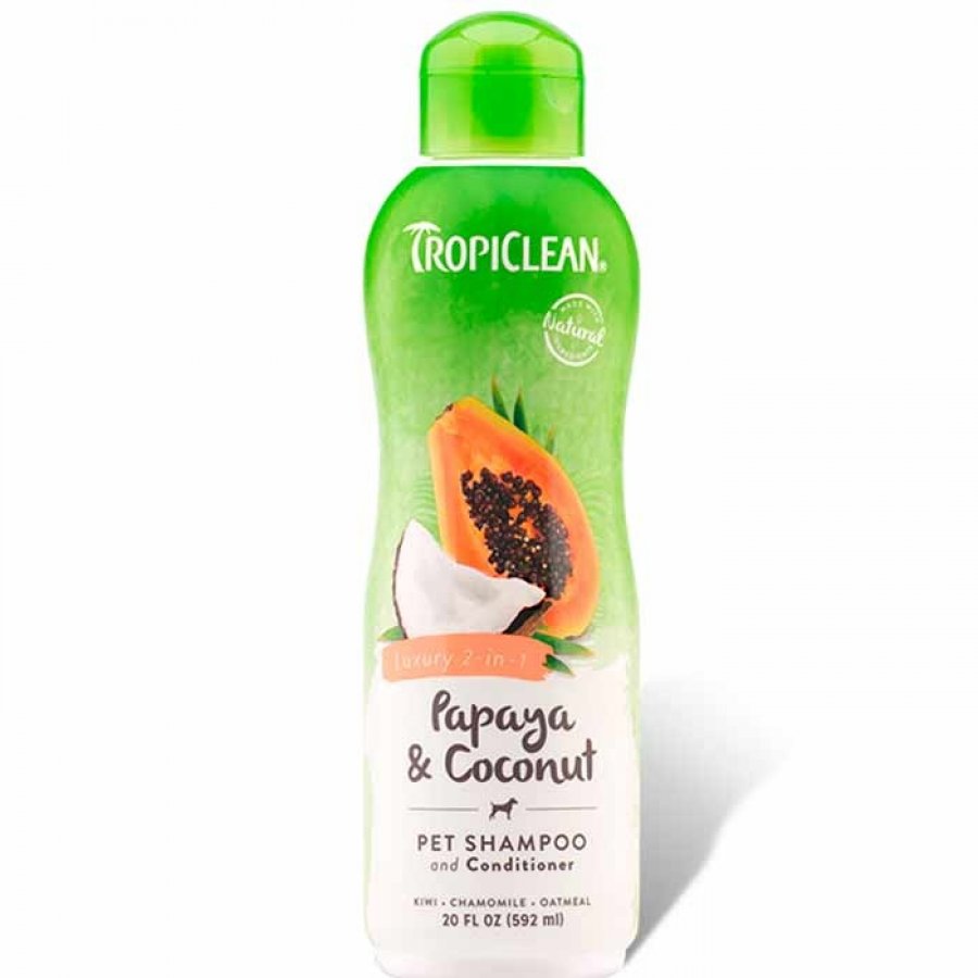 Está hecho con papaya, coco y otros ingredientes tropicales para mimar a su mascota en una rica y lujosa espuma. Nuestro suave limpiador de coco es único en su tipo, al igual que su mascota. El coco limpia suavemente el pelaje de la suciedad y los aceites del juego y las palmaditas en la cabeza, mientras que la papaya y el kiwi reponen el equilibrio natural de humedad de la piel y el pelaje. Los acondicionadores botánicos ricos dan un brillo saludable, al tiempo que previenen la piel seca y el pelaje enredado. Con el baño de rutina, este lujoso champú y acondicionador 2 en 1 mantendrá la piel y el pelaje de su mascota a la vez que suave, brillante y con un aspecto estupendo.