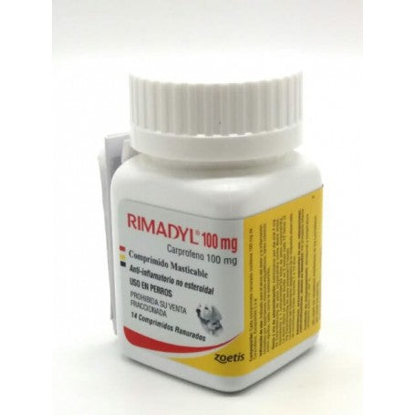 La dosis recomendada para la administración oral en caninos es de 2 mg por kg de Carprofen 2 veces por día o 4 mg por kg de peso corporal en una única dosis diaria." tabletas de Rimadyl 100 cada 50 kg de peso 2 veces por día.Para el control del dolor asociado con la cirugía, administrar 2 hs antes de la intervención.La duración del tratamineto la establecerá el Médico Veterinario que prescribe el producto.