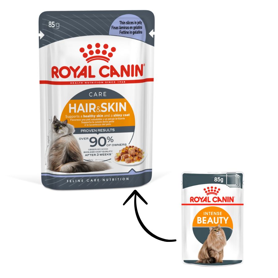 Royal Canin Intense Beauty Pouch es un alimento húmedo indicado para gatos adultos a partir del año de edad. Formulado con Finas láminas en salsa que favorecen la belleza del pelaje de los gatos; Nutre la piel, el pelo y refuerza su brillo gracias a un aporte elevado de ácidos grasos Omega 3 y 6, vitamina B, biotina y zinc. Especialmente desarrollado para una palatabilidad excepcional y moderado en energía. Favorece un sistema urinario sano, reduciendo la concentración de minerales responsables de formar los cálculos urinarios. Sobre de 85 g.
