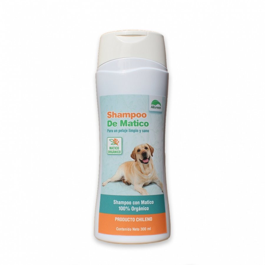 ?Shampoo de Matico Allgreen e?sta? disen?ado para cuidar la piel de los animales con una base completamente natural. Las propiedades cicatrizantes y regeneradoras del matico ayudan a que la dermis de nuestras mascotas permanezca saludable y humectada. El matico y sus propiedades curativas revitalizan y reconstruyen el pelo del animal, aportando nutrientes esenciales para mantenerlo sano. Adema?s, al no tener contraindicaciones puede ser aplicado por nin?os AllGreen cuenta con certificacio?n de cultivo 100% orga?nico otorgada por la Universidad Cato?lica de Chile y la certificadora alemana BCS. Las características de este producto son: El matico tiene propiedades cicatrizantes y desinfectantes. Sin preservantes ni aditivos Sin contraindicaciones Uso externo para todo tipo de animales y mascotas, no solo perros. No contiene perfumes ni colorantes. Modo de uso: Enjuague a su mascota solo con agua para eliminar el polvo y otros contaminantes externos, luego aplicar Shampoo de Matico AllGreen, hacer masajes suaves sobre la piel, dejar actuar el producto 5 minutos y enjuague nuevamente. Contenido:? 300ml.