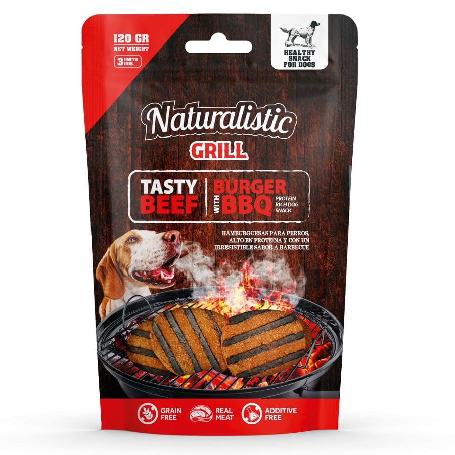 TASTY BEEF BURGER WITH BBQ son snack para perros con forma de hamburguesa y sabroso sabor a vacuno y barbacoa (salsa BBQ). Este delicioso snack para perros ha sido elaborado a base de proteína de carne de vacuno de alta calidad y 100% real, que luego ha sido grillada a la parrilla para ser irresistible.