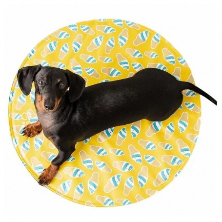 Exterior de Tafetán 100% Poliéster.Base 100% cloruro de polivinilo (PVC). Gel refrescante NO TOXICO. Hasta 7°más frío que la temperatura ambiente. No requiere refrigeración, agua ni electricidad. 80 cm diametro