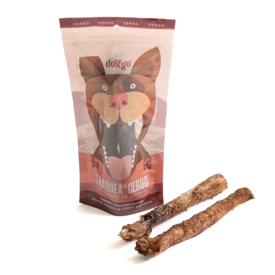 Traquea de cerdo deshidratada a bajas temperaturas, cubierto de carne de ciervo deshidatrada.