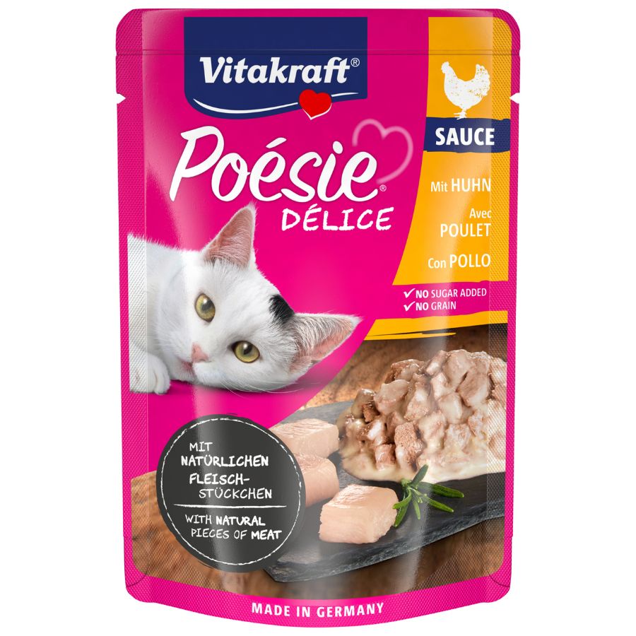 Estos deliciosos aperitivos con tierno filete de pollo en mucha salsa fina ofrece una suave textura que encantará a tu gato. ¡Todo tu amor está en esta bolsita Poésie Déli Sauce!