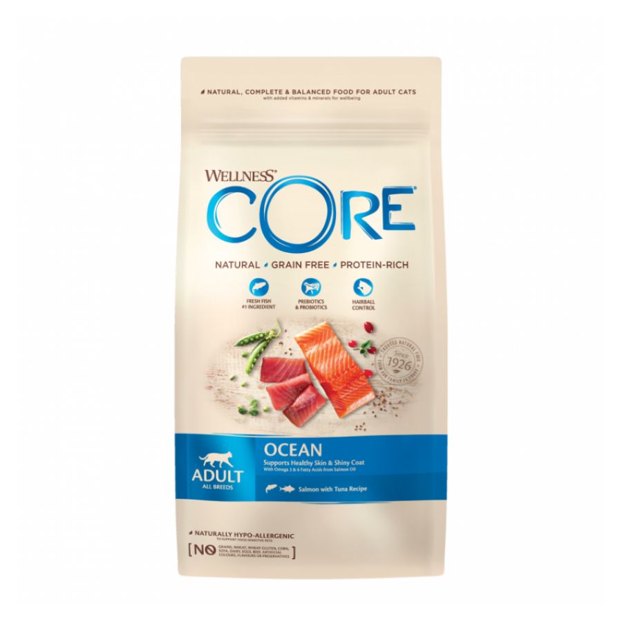 ¿Tu gato prefiere el pescado que la carne? El alimento Wellness Core Ocean para gatos está hecho con una selección de los mejores pescados y sin ningún tipo de carne para que tu felino disfrute más que nunca de sus croquetas. ¡Todo el sabor del mar directo a su plato! Salmón, arenque y atún son los ingredientes principales de esta receta. Un 51% total de proteínas de origen animal procedentes del pescado, con el salmón fresco como primer ingrediente. El pelaje de tu felino estará más lustroso que nunca con este pienso gracias a su alto aporte de ácidos grasos omega 3; al igual que su piel estará muy sana. La fórmula se completa con guisantes, patatas, arándanos rojos y algas deshidratadas para conseguir un alimento equilibrado y saludable. Wellness Core Ocean es rico en proteínas y libre de cereales. Además, tiene vitaminas y minerales añadidos para el bienestar y para el refuerzo inmunitario. Es un alimento naturalmente hipoalergénico sin trigo, maíz, gluten, soja, lácteos, huevos ni carnes. Esto lo convierte en una opción ideal para gatos con intolerancias alimentarias y para aquellos a los que les siente bien la carne o los cereales. Además, contiene prebióticos que mantienen el tracto digestivo sano, por lo que puedes estar seguro de que tu felino tendrá una buena digestión. Las características de este producto son: Nutrición completa y equilibrada. Alimento natural rico en proteínas. Con salmón fresco como primer ingrediente. Sin cereales. Rico en ácidos grasos omega 3. Cuida la salud del pelo y de la piel. Favorece un tránsito intestinal saludable. Con vitaminas y minerales añadidos. Sin conservantes, colorantes ni sabores artificiales.