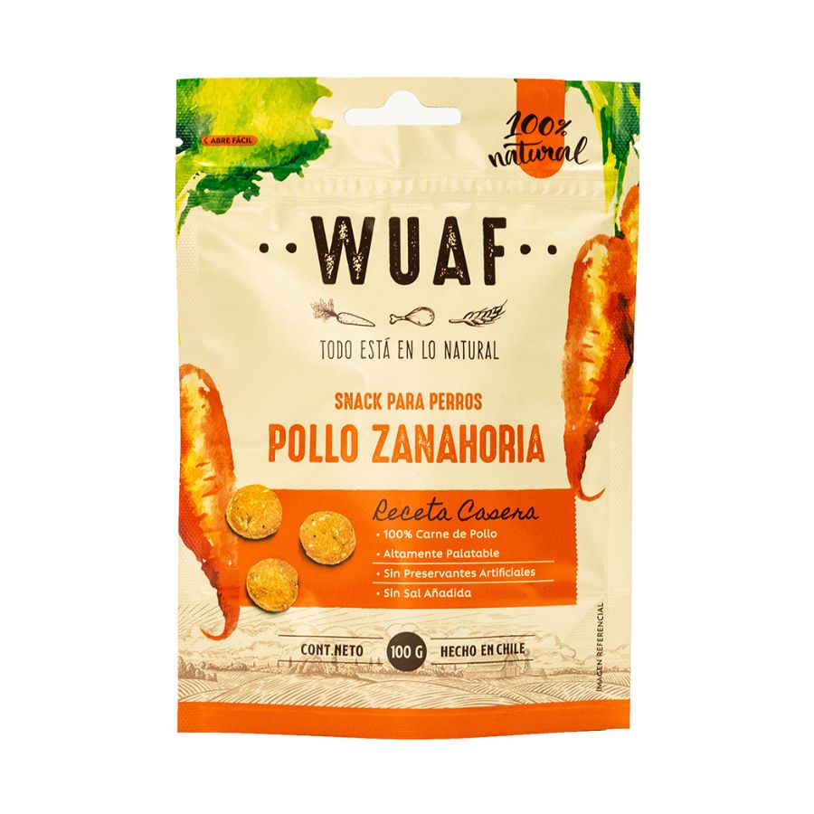 Los snacks de Wuaf Pollo con Zanahoria, provienen de una empresa familiar con un fuerte compromiso por el bienestar de las mascotas, por esta razón, les encanta cuando nuestras mascotas disfrutan de una rica comida. Con esto en mente, quisieron innovar y prepararon el mejor snack que puedan tener. Seleccionan ingredientes naturales de gran calidad, preparados de manera casera, sin ningún tipo de preservantes ni aditivos, todo hecho a mano y sobre todo con mucho amor. Características del producto: Proteína 100% carne de pollo · 0% subproducto animal · Ingredientes de primera calidad sin proceso · Receta casera · Galleta horneada · Duración envase cerrado 1 año · Duración envase abierto 30 días